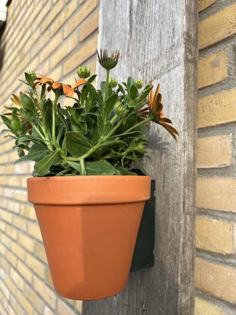- Ja nu kan het, met deze bloempotklem kun je overal je bloemetjes buiten hangen,