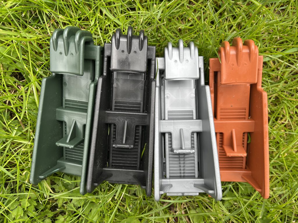 - zwart, donkergroen, zilvergrijs en terracotta.